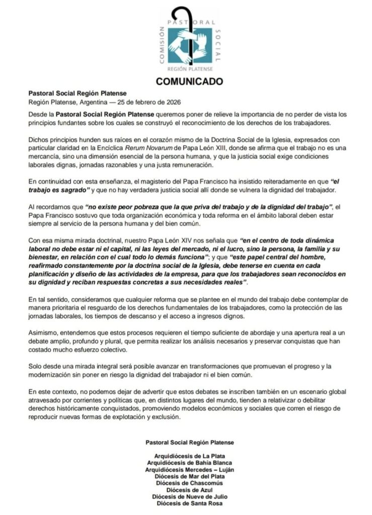 La Pastoral Social Región Platense, de la cual es parte la Arquidiócesis de Bahía Blanca, manifiesta que cualquier reforma que se plantee en el mundo del trabajo debe contemplar de manera prioritaria el resguardo de los derechos fundamentales de los trabajadores, como la protección de las jornadas laborales, los tiempos de descanso y el acceso a ingresos dignos.